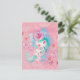 Una pintura de fantasía original en acrílico titulada: "Amor de gatito". Una niña linda y kawaii, con cabello largo y brillante turquesa, vestida con un gran lazo azul con un lazo rosa en el centro, abraza a un adorable gatito blanco. El fondo rosa está decorado con pequeñas rosas rojas y delicadas mariposas lavanda.