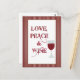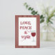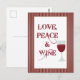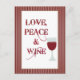 "Amor, Paz & Vino" en estilo grunge funky con vaso de vino tinto y fondo a rayas