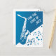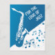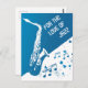 Esta postal presenta un color dominante azul-blanco, un ilustracion saxofónico plano, notas musicales, corazones azules y el texto por defecto del personalizable "por amor al jazz". ¡Un gran diseño para los amantes de la música y del jazz!