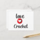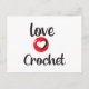 tarjeta postal para una persona que teje al crochet, letras grandes rojas y negras y un corazón. "Amor por Tejer al Crochet"