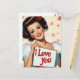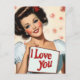 Un ilustracion vibrante en el estilo clásico de los años 50. La imagen muestra a una mujer glamurosa con rizos vintage, maquillaje audaz y una sonrisa radiante. Lleva un cartel con un mensaje de amor, "Te amo", puesto en un fondo de delicadas rosas rosas. La estética general capta el ambiente romántico y lúdico del arte de base de mediados de siglo.