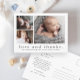 Simple Love and Gracias 3 Photo Baby Tarjeta de agradecimiento con un sencillo y moderno tipo y 3 fotos en la parte delantera. La parte trasera es una postal que se puede enviar por correo con un encabezado de nombre completo grande y un mensaje personal de la familia. Haga clic en el botón de edición para personalizar este diseño con sus fotos y detalles.
