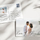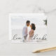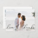 Una tarjeta postal moderna y elegante de agradecimiento diseñada para acomodar tu foto boda horizontal o paisajista favorita con "amor y gracias" como un texto de escritura suave en negro. Personalice con sus nombres y/o fecha de boda debajo. Las postales se invierten para mostrar su dirección de retorno con amplio espacio para el direccionamiento del destinatario, así como un mensaje preimpreso opcional y una foto adicional. Si prefiere agregar un mensaje manuscrito, simplemente elimine el texto de ejemplo que se muestra.