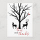 Esta tarjeta de amor y agradecimiento de invierno incluye una silueta de ciervo y una pareja de ciervos de buck. Están parados bajo un árbol sin hojas con un pájaro rojo. ^