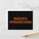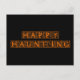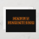 "Happy Haunting" texto ornamental en vibrantes letras naranjas, un diseño humorístico y sofisticado para una Halloween inquietante