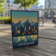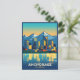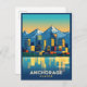 Ilustracion estilizado del Anchorage, horizonte de Alaska al atardecer, con montañas, agua y edificios de la ciudad.