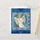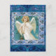 Un pequeño ángel guardián bonito con una trompeta. El fondo es azul.