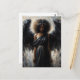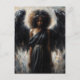 Esta postal presenta una obra de arte impresionista de una chica ángel negro con alas negras, sus ojos arrojados hacia abajo, evocando la introspección, la paz y la sabiduría eterna. Vestida con un traje de inspiración negra y florido de inspiración griega con acentos dorados, irradia fuerza tranquila y gracia etérea. Su cabello natural está coronado con un delicado laurel de oro, simbolizando la presencia divina. El fondo combina tonos morados de carbón vegetal, marfil y oro suave, creando un contraste dramático que mejora la energía celeste de la figura. Este arte original celebra la feminidad negra, el poder espiritual y la fantasía de la elegancia.