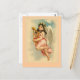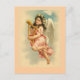 Hermosa imagen vintage de un niño ángel de pelo oscuro vestido de rosa con una corona floral amarilla en la cabeza y llevando su arpa.