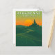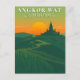 Una hermosa tarjeta postal de viaje al estilo vintage de Angkor Wat, el monumento más emblemático de Camboya. La obra de arte muestra terrazas de arroz que conducen al templo bajo una puesta de sol brillante. Ideal para amantes de los viajes, coleccionistas de tarjetas postales o cualquier persona que aprecie destinos del patrimonio mundial.