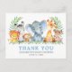 Tarjeta de agradecimiento para Baby Shower con Animales de Safari en Acuarela y Verde. Los animales bebé incluyen elefante, mono, jirafa, rinoceronte, cebra y león sobre hojas de helecho. Botánica en acuarela con verde.