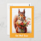 Imagen de una ardilla linda sosteniendo un ramo de flores en sus patas con el texto Mejora Pronto - imagen generada con la ayuda de IA.
