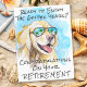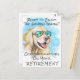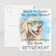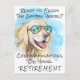Tarjeta de felicitación por jubilación divertida y moderna con un perro golden retriever en una playa tropical. Diseño original creado a partir de una de nuestras acuarelas pintadas a mano.