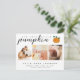 Esta linda tarjeta de anuncio de bebé es perfecta para presentar a tu pequeño bebé de otoño. ¡También puedes enviarla como tarjeta de agradecimiento de Acción de Gracias y tarjeta de agradecimiento de baby shower! El diseño simple pero elegante presenta tres de tus fotos familiares favoritas y una mezcla de tipografía moderna y elegante con letra manuscrita. También hay una imagen de calabaza adorable para acompañar el texto.