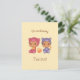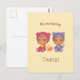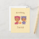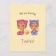 Bebés de dibujos animados lindos con overoles de animales. El de la izquierda está vestido con un mono de oso magenta con un babero amarillo con una pequeña estrella. El de la derecha está vestido de gato morado y sostiene un sonajero de bebé con forma de campana de gato. Una bola brillante descansa entre ellos.
