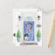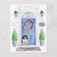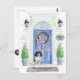 Anuncia tu nueva dirección con nuestro elegante anuncio que presenta un English Springer Spaniel, puerta principal azul, alfombra de bienvenida, letrero de pizarra, topiarios y una corona floral sobre un fondo de ladrillo gris.