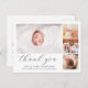 Este anuncio de la moda de parto atemporal y la foto gracias a la postal es ideal para todo aquel que quiera agradecer a los invitados en su ducha de bebé por los regalos, el amor y el apoyo que han recibido y para presentar a su nuevo miembro de la familia. El diseño moderno y elegante tiene un estilo minimalista y cuenta con cuatro fotos de personalizable colocadas en el collage, una tipografía simple y elegante para tu información, y un guión de moda para un encabezado "gracias". Al contrario, hay un mensaje de agradecimiento al personalizable con sus nombres. Utilice el botón "personalizar" para reemplazar fotos y editar texto.