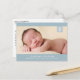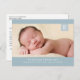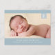 ¡Esta postal moderna de anuncios de natalidad facilita compartir con sus seres queridos sus emocionantes noticias de recién nacido! Personalice la postal azul dulce agregando su foto favorita al frente, personalizar el monograma azul y blanco, y agregue el nombre del recién nacido y los detalles de su nacimiento en la parte inferior. En la parte posterior, puede escribir un mensaje personal a los destinatarios.