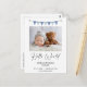 Una sola foto moderna en el anverso del anuncio de nacimiento del niño con una bandera azul de escribano, título de caligrafía moderna y texto negro. Esta tarjeta postal de anuncio de nacimiento moderna es una forma dulce de anunciar el nacimiento de su bebé recién nacido.