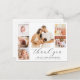 Este anuncio de nacimiento moderno y atemporal y tarjeta postal de agradecimiento con varias fotos es ideal para cualquiera que desee agradecer a los invitados en su baby shower por los regalos, el amor y el apoyo que han recibido y para presentar al nuevo miembro de la familia. El diseño elegante tiene un estilo minimalista y cuenta con un collage de fotos de seis fotos personalizables, tipografía simple y elegante para su información, y un guión escrito a mano con estilo para un encabezado de "gracias". En el reverso, hay un mensaje de agradecimiento personalizable con sus nombres. Utilice el botón "personalizar" para reemplazar fotos y editar texto.