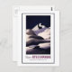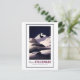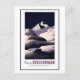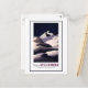 postal con un anuncio de viaje vintage para Austria. Un ilustracion paisajístico de colinas nevadas y montañas con una cabaña aislada.