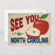 Una encantadora postal de viaje de Carolina del Norte con una hermosa manzana roja, junto con un divertido texto de estilo retro que dice, "Nos vemos en Carolina del Norte"