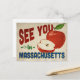Una encantadora postal de viaje vintage de Massachusetts con una hermosa manzana roja, junto con un divertido texto de estilo retro que dice, "Nos vemos en Massachusetts"