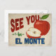 Una encantadora postal de viaje vintage de El Monte California con una hermosa manzana roja, junto con un divertido texto de estilo retro que dice, "Nos vemos en El Monte"
