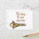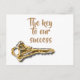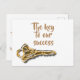 La imagen de esta postal tiene una llave giratoria de oro y plata. El texto de la parte delantera dice, "La clave de nuestro éxito" con la parte trasera diciendo, "eres tú. Gracias" junto con su nombre comercial. Todo el texto puede cambiarse fácilmente para adaptarlo a sus necesidades. Esta es una manera económica e impresionante de dar las gracias a sus empleados, clientes o clientes. Destacarse de otros negocios expresando su aprecio a aquellos que ayudan a que su negocio crezca y tenga éxito.