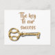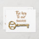 La imagen de esta postal tiene una llave antigua de oro y plata. El texto de la parte delantera dice, "La clave de nuestro éxito" con la parte trasera diciendo, "eres tú. Gracias" junto con su nombre comercial. Todo el texto puede cambiarse fácilmente para adaptarlo a sus necesidades. Esta es una manera económica e impresionante de dar las gracias a sus empleados, clientes o clientes. Destacarse de otros negocios expresando su aprecio a aquellos que ayudan a que su negocio crezca y tenga éxito.