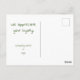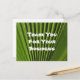 Diga "gracias" a sus fieles clientes con esta barata postal. Esta tarjeta de apreciación es la manera perfecta de construir su negocio y hacer saber a sus clientes que usted está agradecido por su negocio. Esta tarjeta contiene una foto de la naturaleza que captura una hoja de palmera verde brillante que muestra los profundos y sombreados bosques de esta planta tropical. "Gracias por su negocio" se centra en una gran fuente blanca y puede ser personalizado rápidamente si lo desea. La parte posterior de esta postal se puede personalizar rápidamente.