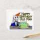 Un divertido diseño de cumpleaños con un esqueleto con gorra fiesta y telarañas colgadas por todas partes, sentado frente a su pastel de cumpleaños. ¡Feliz cumpleaños, viejo!