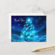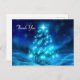 Tarjeta de agradecimiento con un árbol de Navidad azul eléctrico moderno. Decorado con luces alrededor. El fondo tiene luces borrosas desvanecidas.