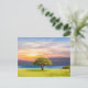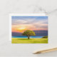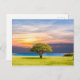Hermoso paisaje en esta postal. Un árbol central, situado contra un cielo colorido y una hierba vibrante.