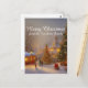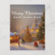 Feliz Navidad! Un diseño nostálgico con árboles de Navidad en una nevada plaza de pueblo con gente del lugar divirtiéndose. Siéntase libre de personalizar del saludo principal, y (por supuesto) de su propio apellido.