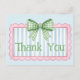 Esta linda tarjeta de agradecimiento presenta un marco rosa con rayas azules y blancas y coronada con un lazo de cuadros de gingham verde y blanco. Personalice con su elección de texto especial.
