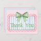 Esta tarjeta de agradecimiento linda cuenta con un marco rosa con franjas azules y blancas y rematada con un lazo de gingham verde y blanco. Personalice con su texto especial elegido.