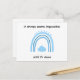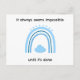 Este bello diseño hecho a mano presenta un arco iris azul minimalista con una nube blanca esponjosa. La inspiradora cita "Siempre parece imposible hasta que se hace" motivará y animará a cualquiera que ponga sus ojos en ello. El color azul del arcoiris representa tranquilidad y paz, mientras que la nube simboliza el potencial ilimitado de nuestros sueños. Perfecto para aquellos que necesitan un empujón extra para lograr sus metas y aspiraciones, este diseño inspirará y animará a cualquiera que lo reciba.
