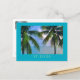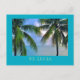 Palmeras, aguas caribeñas, velero y arco iris a lo lejos.