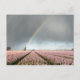 Postal de un arcoiris y nubes oscuras durante una tormenta primaveral sobre un paisaje con un viejo molino de viento y flores de jacinto rosadas en la región holandesa de Bulb.