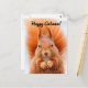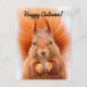 La foto ascendente adorable, cercana de una ardilla roja con el mensaje, "otoño feliz" se ofrece en esta postal. ¡Una manera linda de enviar saludos del otoño a la familia o a los amigos!