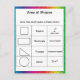 Una postal matemática divertida que puede ser usada para referencia rápida que tiene fórmulas de área para cuadrados, círculos, rectángulos y triángulos contra un fondo arco iris!