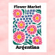 Celebrate the lively and colorful flora of South America with this striking Argentina Flower Market design. This modern illustration features a high-energy arrangement of large, radiant pink blossoms with golden centers, surrounded by a sprinkle of delicate blue-and-white meadow flowers.