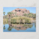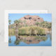 Una montaña distintiva en el Parque Papago, Phoenix, Arizona, se refleja en un pequeño lago. El cielo azul intenso y las palmeras rodean la montaña marrón, tanto en la parte superior de la postal como en la reflexión. Las palabras "saludos desde Arizona" pueden ser fácilmente personalizadas o borradas a su deseo.