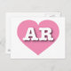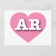 Esta postal contiene un corazón fresco rosado que contiene las letras negrita, blanca y alta del funda AR, la abreviatura oficial de Arkansas, el estado natural. El reverso de la tarjeta está en blanco, esperando tus sentimientos escritos a mano o texto personalizado.