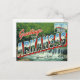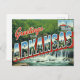 This beautiful retro-style design celebrates the natural beauty of the Natural State. It features the classic "Greetings from ARKANSAS" typography set against a scene dominated by a rushing waterfall and lush green forests. An inset picture highlights a historic neoclassical building, blending natural scenery with the state's heritage. Perfect for fans of vintage travel posters, retro artwork, nature, hiking, and the state's picturesque rivers and woods.