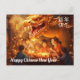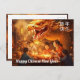 Personalizable delante y detrás de la postal de Año Nuevo chino con un ilustracion encantador que captura el espíritu de una alegre celebración de Año Nuevo chino. Una familia china feliz y alegre, incluyendo niños, se reúne alrededor de una comida festiva. La mesa está adornada con platos tradicionales que simbolizan la prosperidad y la buena suerte. En el fondo, un magnífico dragón dorado traga con gracia el aire, añadiendo un toque extra de magia y festividad a la escena.