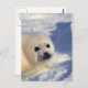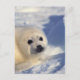 Un cachorro increíblemente lindo de sello de arpa mirando hacia la cámara mientras se sienta en el hielo.