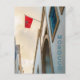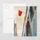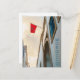 Esta elegante postal presenta la vibrante bandera roja de Marruecos ondeando orgullosamente contra un telón de fondo de arquitectura tradicional blanqueada. Una suave tipografía vertical azul "MARRUECOS" complementa la intrincada ventana de celosía azul. Es el recuerdo perfecto para viajeros y amantes de la cultura marroquí y la fotografía escénica.