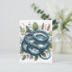 Esta postal contiene una pintura acuarela de una serpiente azul enrojecida. Las escalas de la serpiente son muy detalladas y muestran un degradado de tonos azules con toques de blanco y de tono más oscuro, aportando profundidad y realismo. Su cuerpo elegante está artísticamente colocado en medio de una exuberante distribución de vegetación y elementos botánicos, incluyendo hojas y flores pequeñas y delicadas en tonos mudos de rojos verdes, azules y tierra. La composición equilibra la forma fluida y dinámica de la serpiente con los elementos suaves y naturales, creando un efecto visual armonioso y llamativo.